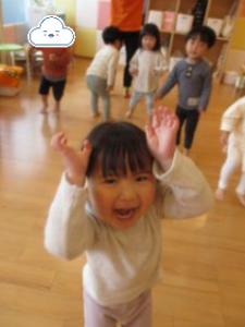 「その手を上に~」でお星さま、「横に~」で飛行機、「前に~」で自動車、「下に~」で太鼓に変身して手をキラキラしたり手を大きく広げて走ったり、それぞれの動きを楽しんでいます![]()