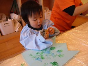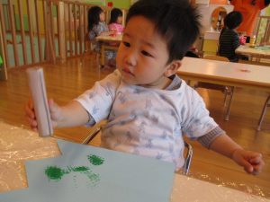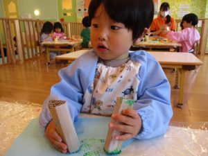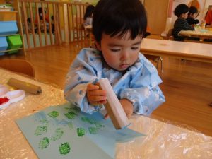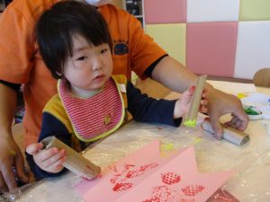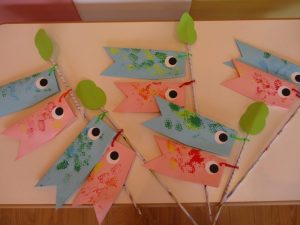 いちご組さんは手作りスタンプを使ってこいのぼりを作りました![]()