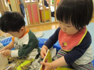 新聞紙のお風呂に入って絵本タイム![]()