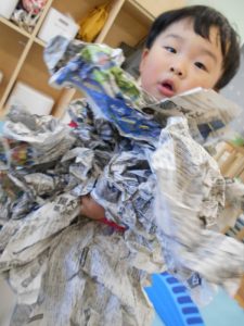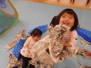 りんご組さんにもなると、新聞紙あそびもダイナミックになってきます!!
