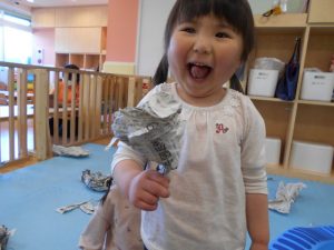 ちぎったり丸めたりしながら『ビリビリ』『くしゃくしゃ』と音を楽しむ感覚あそび、帽子やボールを作って楽しむ見立てあそびなど、様々な遊び方ができるのが新聞紙のいいところです![]()