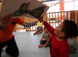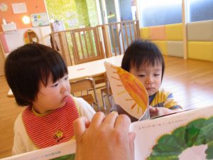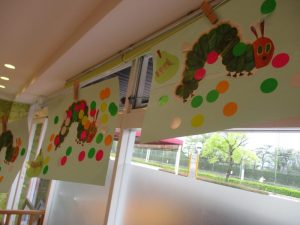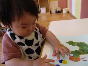 まずは子どもたちの大好きな「はらぺこあおむし」の絵本を見ました![]()