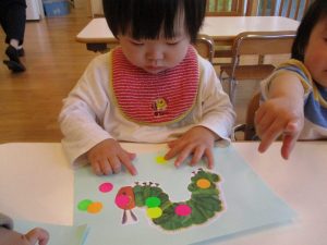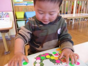 台紙からシールを取るのに少し苦戦したり、指にくっついたシールがなかなか貼れず『あれ~?』とにらめっこしたりするお友だちもいましたが、保育者に手伝ってもらいながら『これも、これも』と夢中な子どもたち![]()