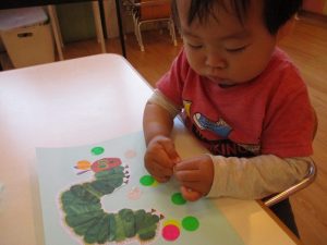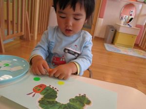 ストーリーを楽しんだ後は『みんなのあおむしさんにも、ごはんをあげよう!!』とシール貼りに挑戦です!!