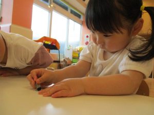 まずはクレヨンでカエルさんの目と鼻を描きました![]()
