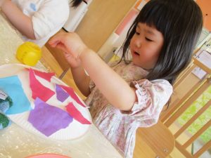 ちぎった折り紙を紙皿に貼ると・・・できあがり![]()