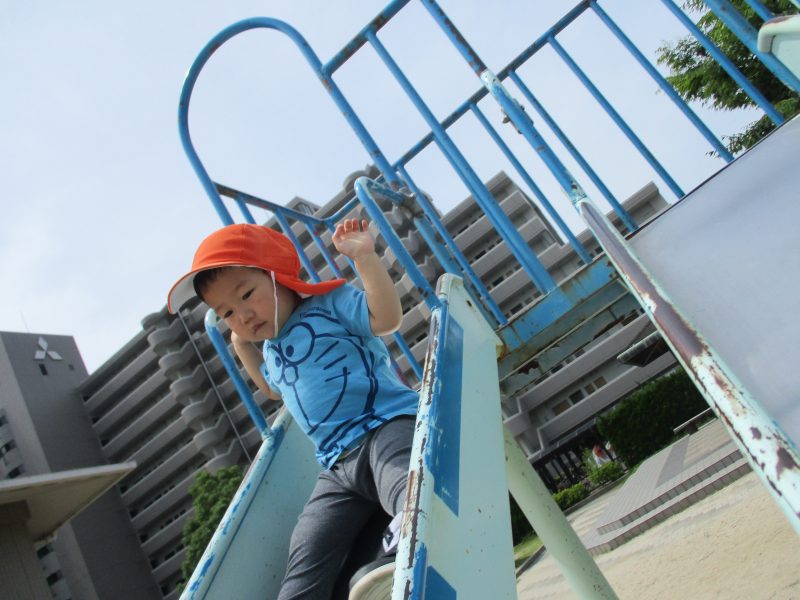階段も『自分で』と意欲的で時々渋滞になることもありますが、登り切った後の笑顔はとても満足そうで、保育者に『おーい』と手を振ったり上からの眺めを楽しんだりしています![]()