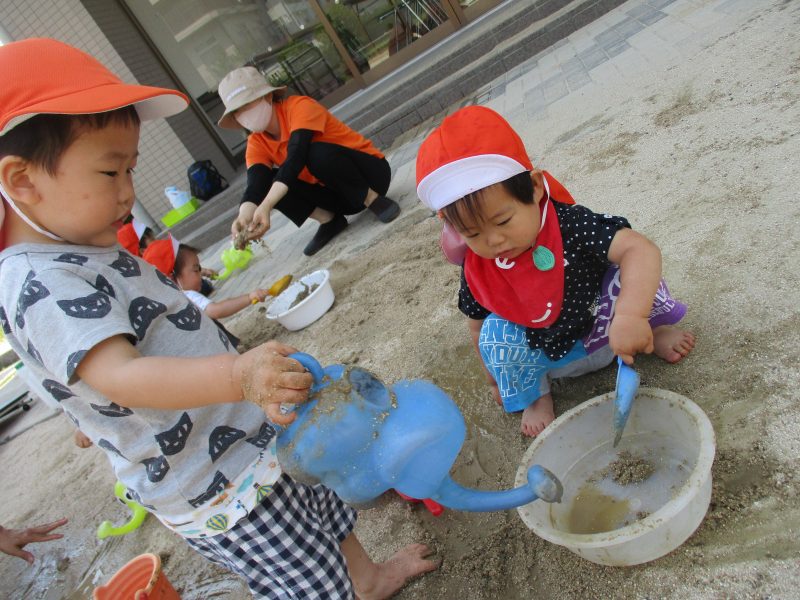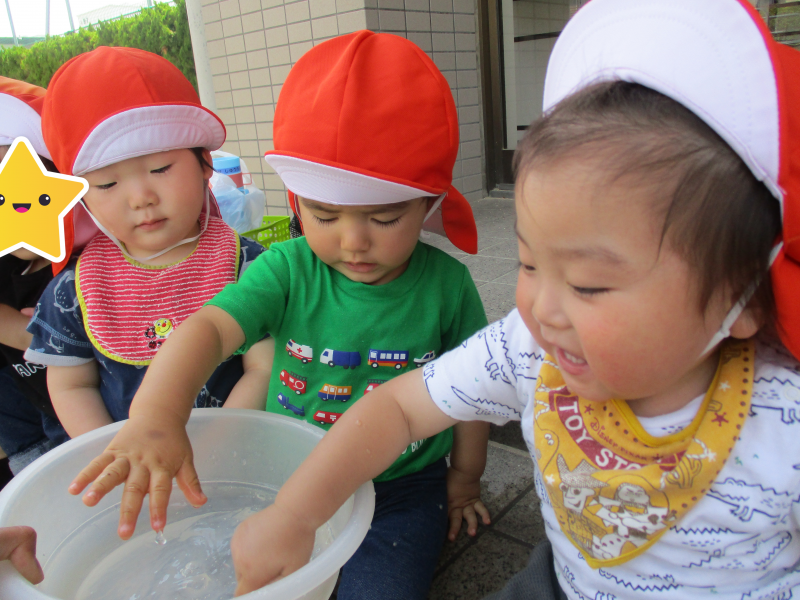 『今日はお水を使って泥んこあそびをするよ』という保育者の言葉に子どもたちも興味津々![]()