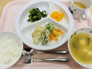 ご飯 味噌汁 野菜の天ぷら 小松菜のおかか和え オレンジ