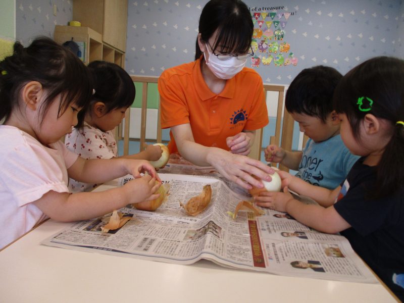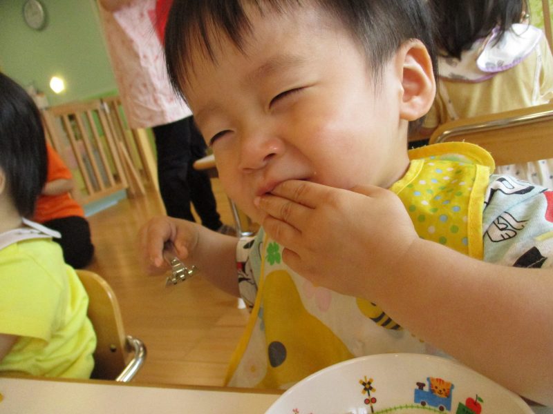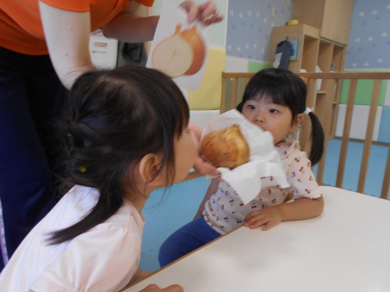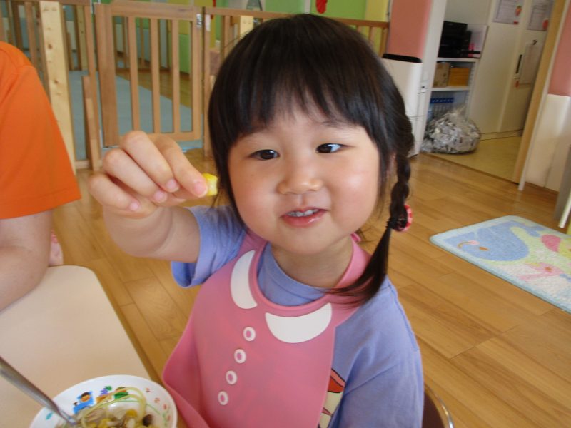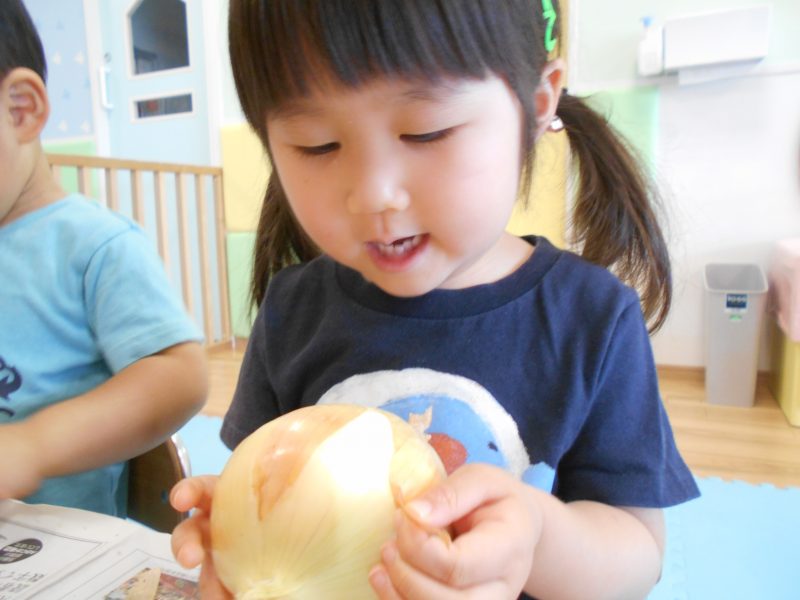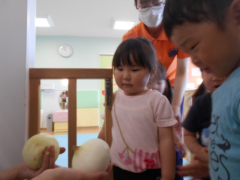 自分たちが皮をむいた玉ねぎを見て『玉ねぎあった!!』『甘いかな?』『大きいお口で食べるよ!』といつもより賑やかなおやつタイムとなりました![]()