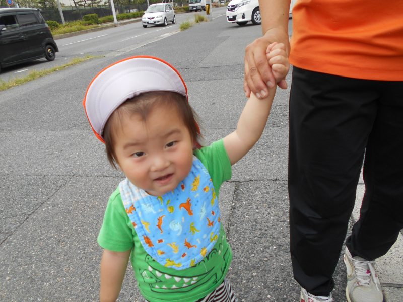 順番に保育者と手を繋ぎ、歩く練習をしています![]()