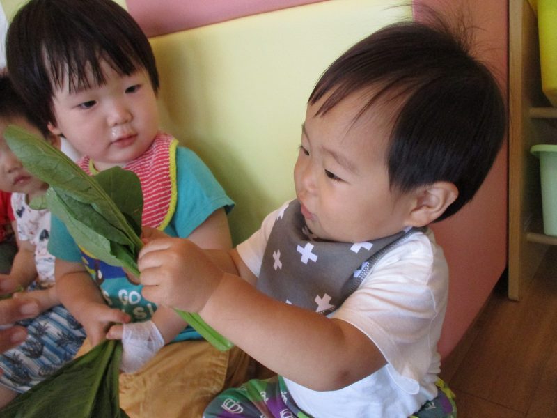 茎を切る前の小松菜を渡してみると『食べていいの~?』と思わず口に運んでしまいそうな子どもたち![]()