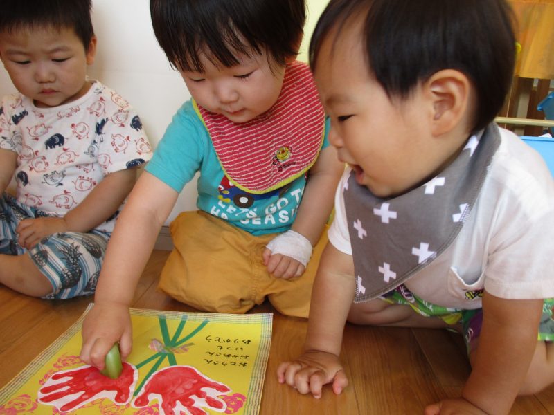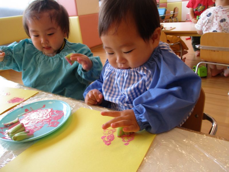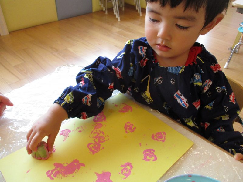 初めは手が汚れるのを気にするお友だちもいましたが、どんどん増えていくお花が嬉しく、自分で絵の具をつけようとする姿も見られ、スタンプあそびの楽しさを感じているようでした![]()
