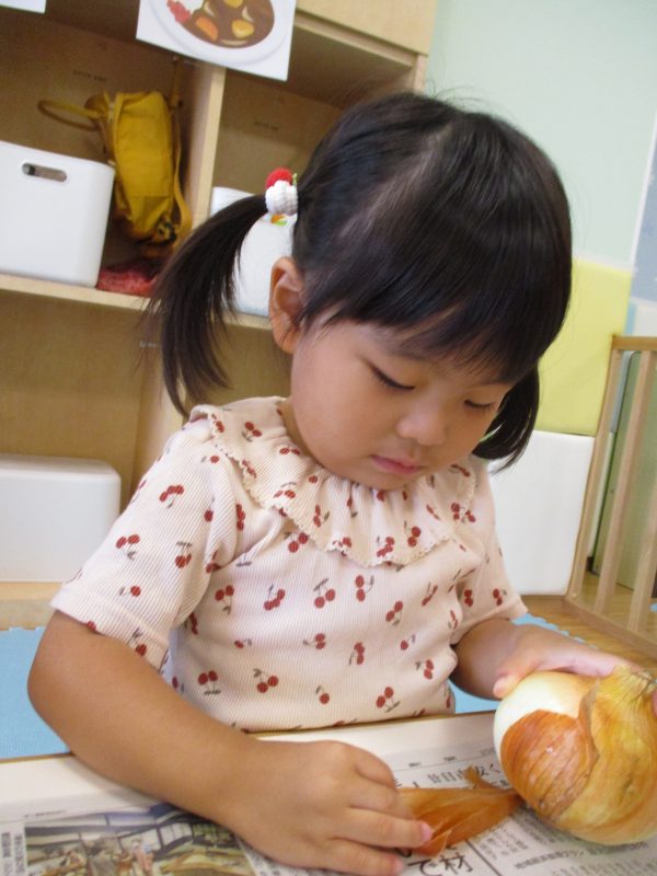 りんご組さんが玉ねぎの皮むきをお手伝いしてくれました![]()