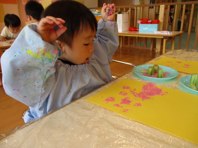 絵の具をつけてスタンプしてみると、かわいらしいお花の模様ができました![]()