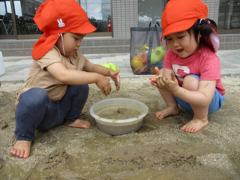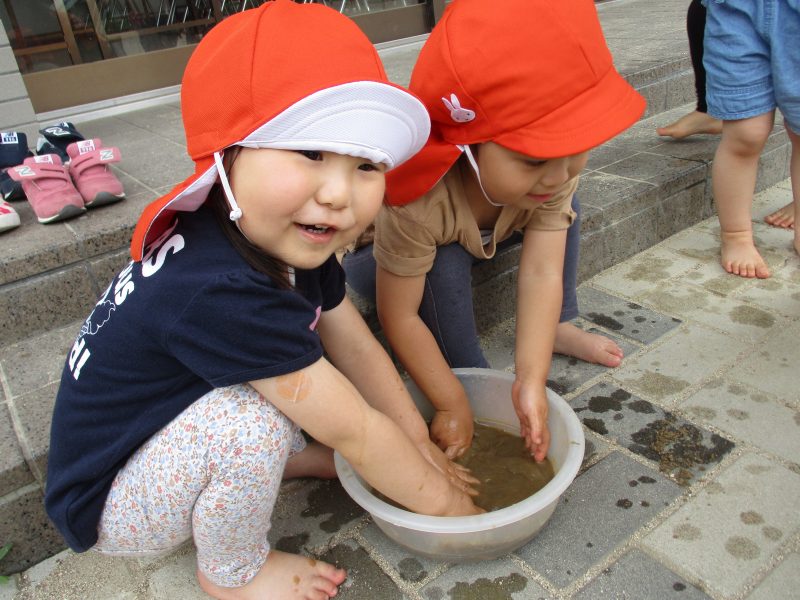 そして 木曜日には先週のいちご組さんに続き、りんご組さんが泥んこあそびをしました![]()