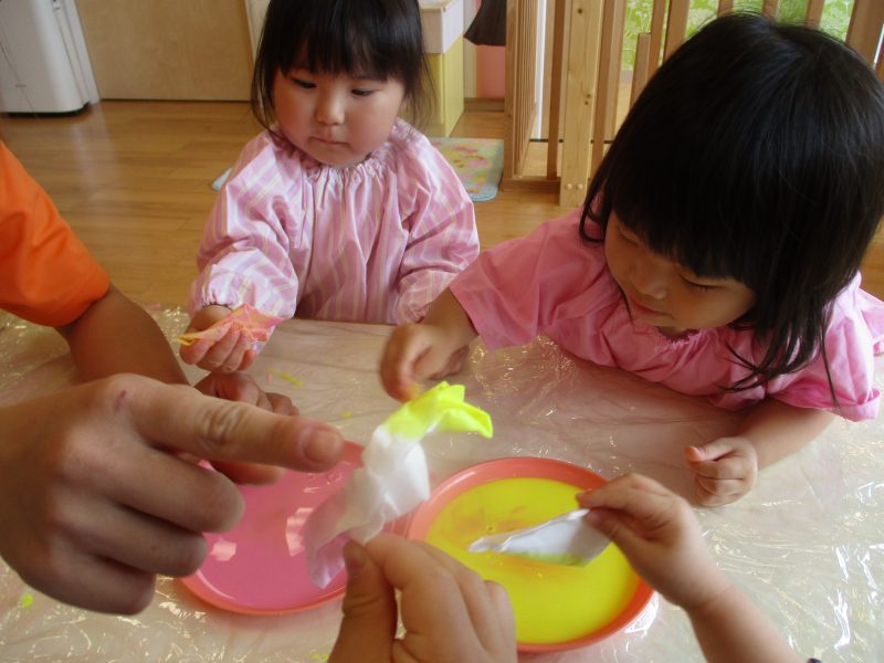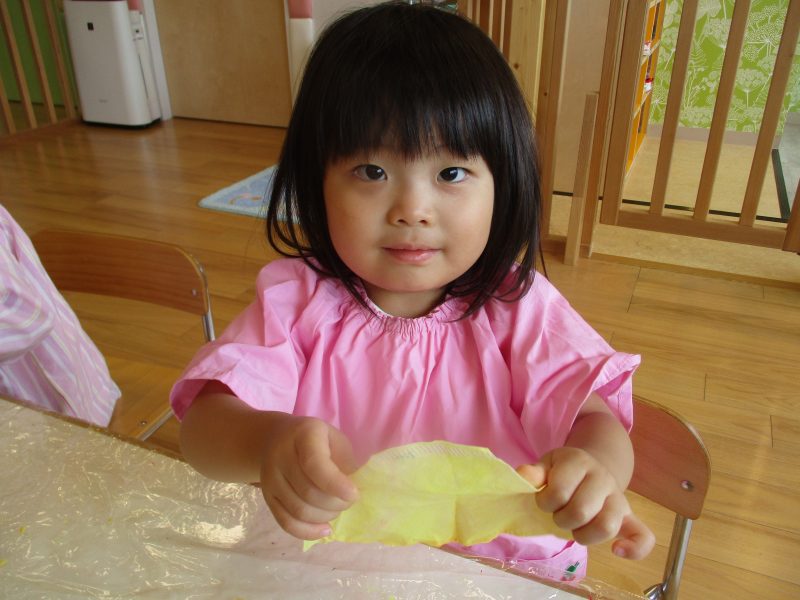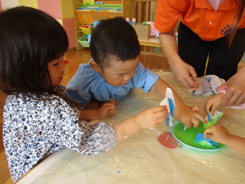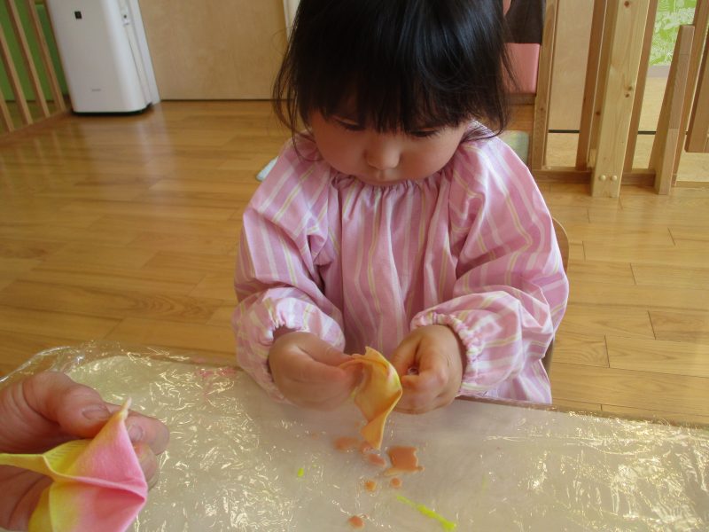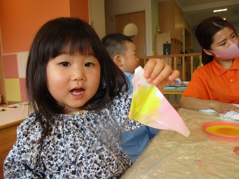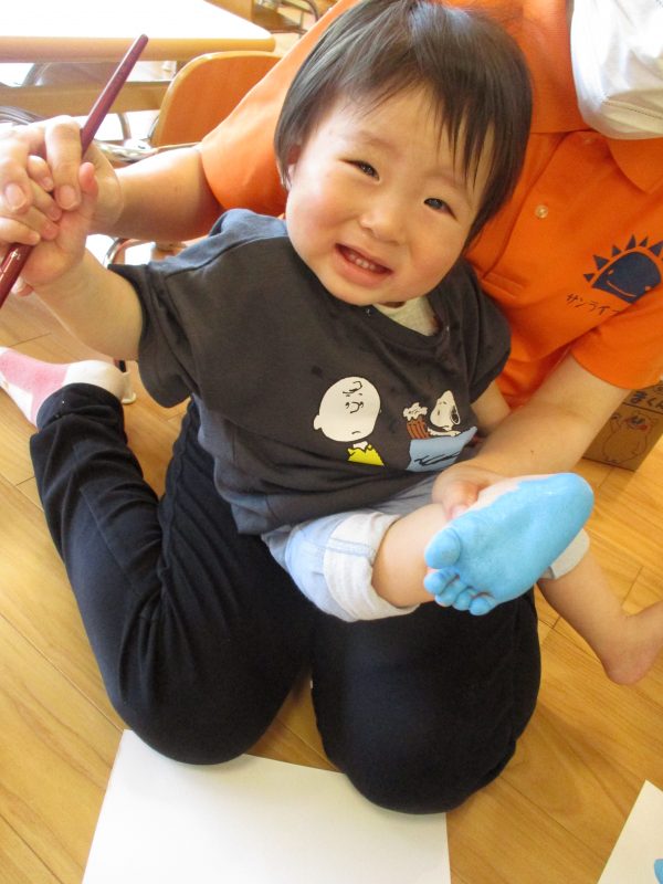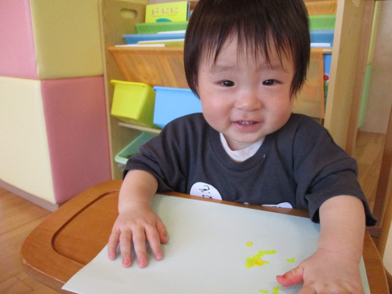 手についた絵の具を不思議そうに眺めていましたが、『ペタペタ』と画用紙に色がつく様子を楽しんでいました![]()