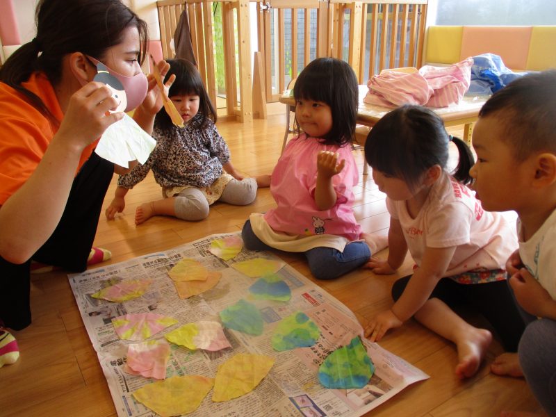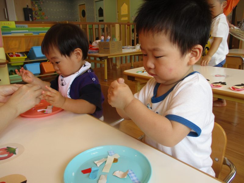 新聞紙よりとっても小さい折り紙をちぎるのは難しかったようですが、少し切れ目を入れると指先を使いながら『自分で』と頑張っていました![]()