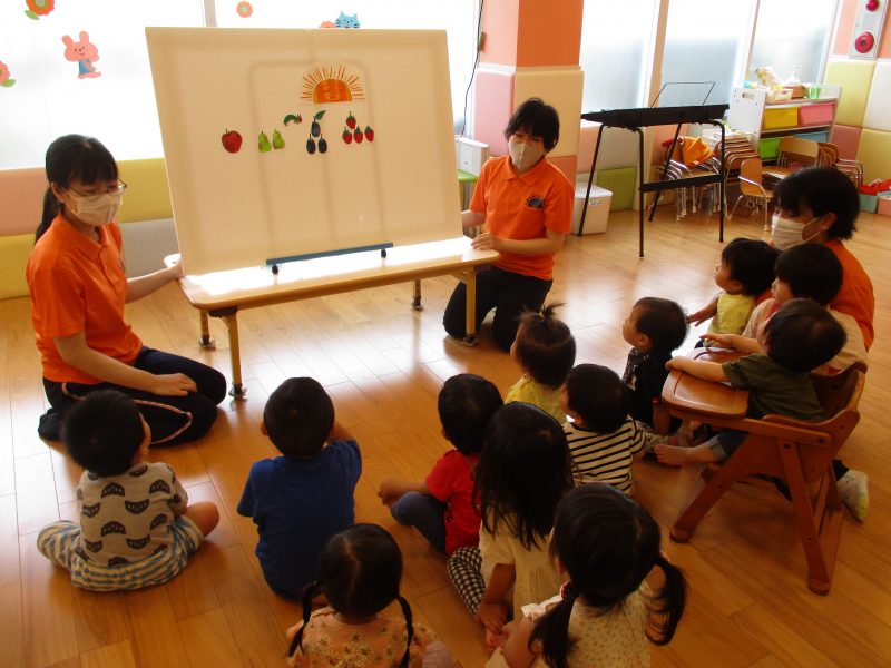 そして先生たちからのプレゼントは『はらぺこあおむし』のパネルシアターです![]()