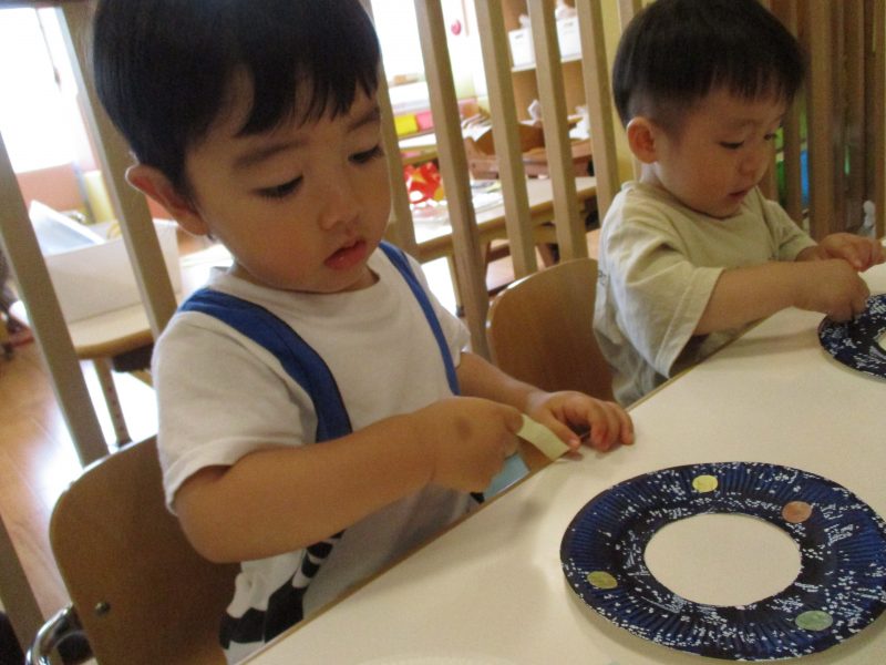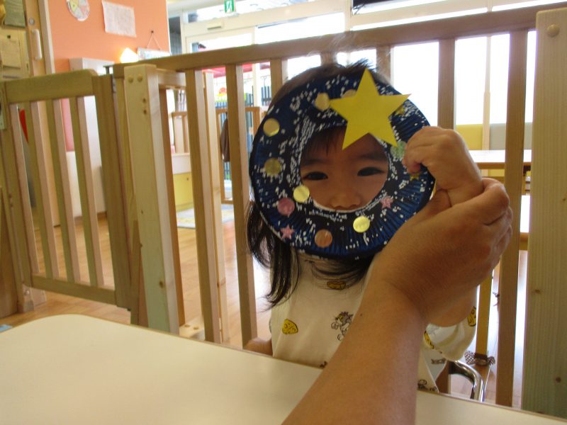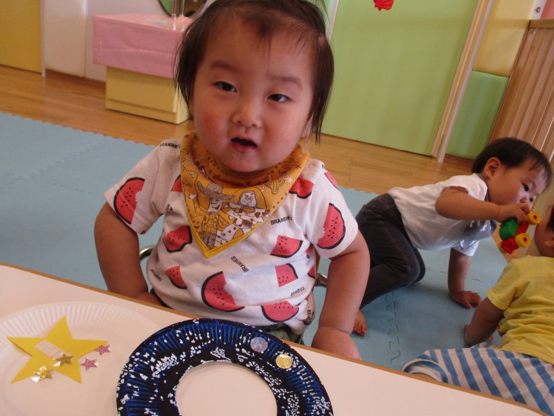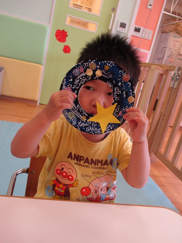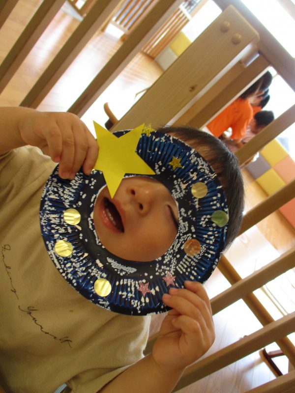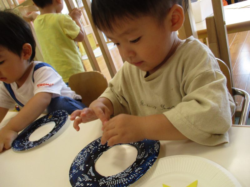 青く塗った紙皿に金や銀、星のシールを貼り、天の川を作りました![]()