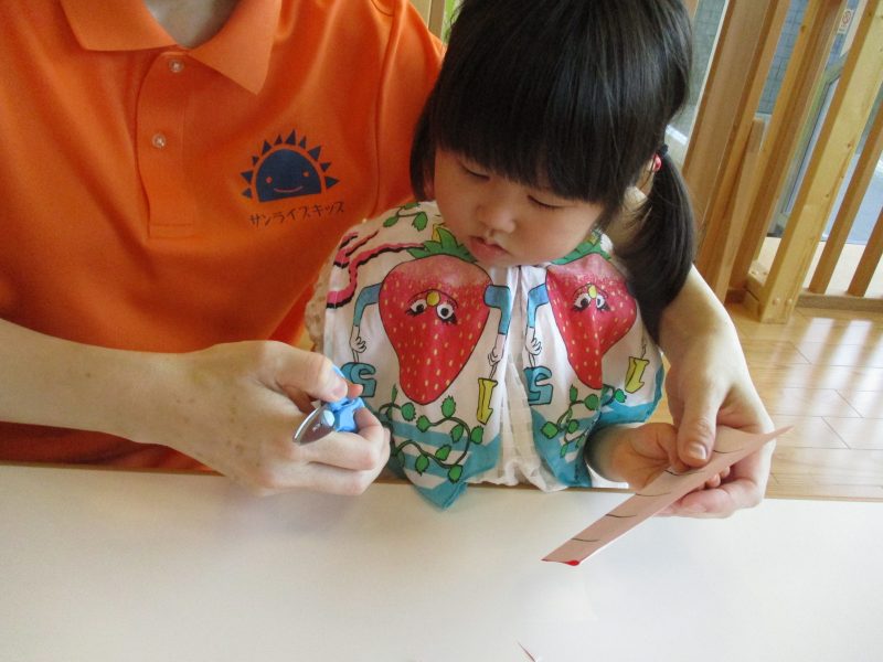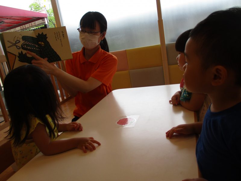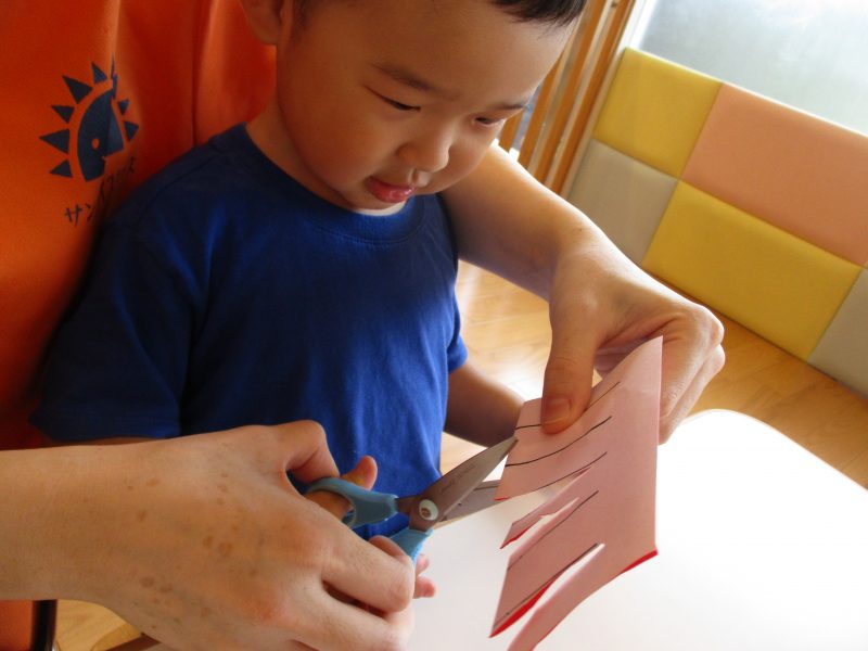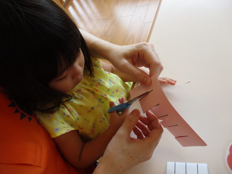 絵本『わにわにのおおけが』を見て指を切らないように気をつけながら チョキン![]()