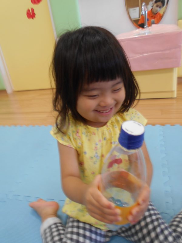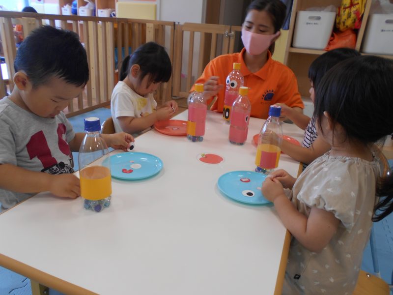 ペットボトルに目や口などのシールを貼って飾り付けました!