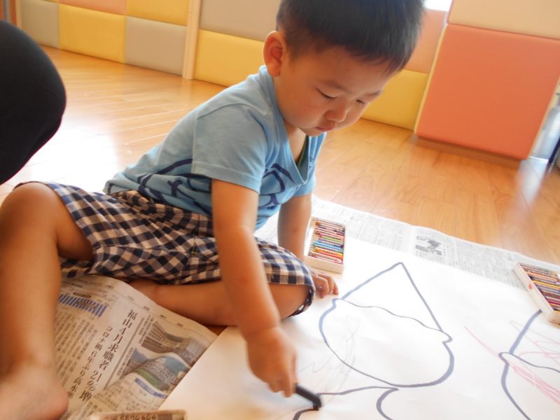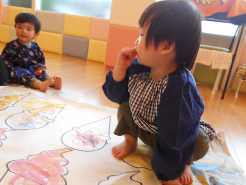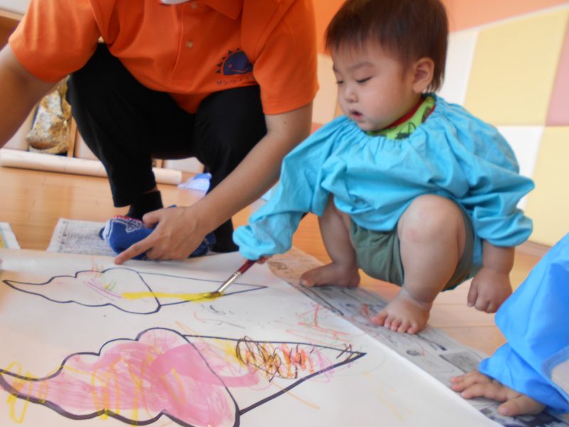 いちご組さんは、大きな模造紙に描かれたアイスクリームにクレヨンや絵具で色塗りをしてあそびました![]()