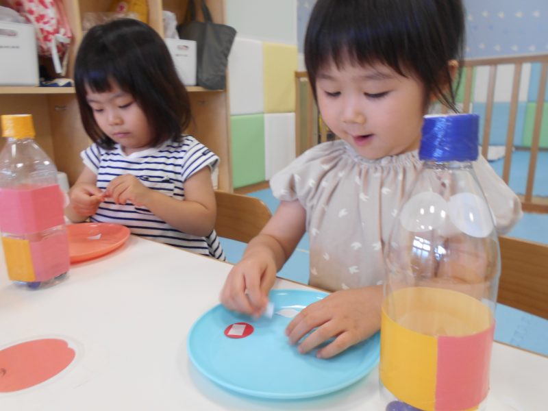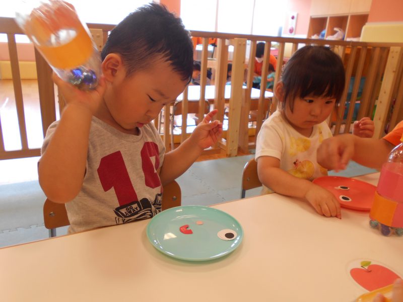シールを剝がしに集中するりんご組さん♪