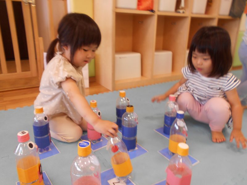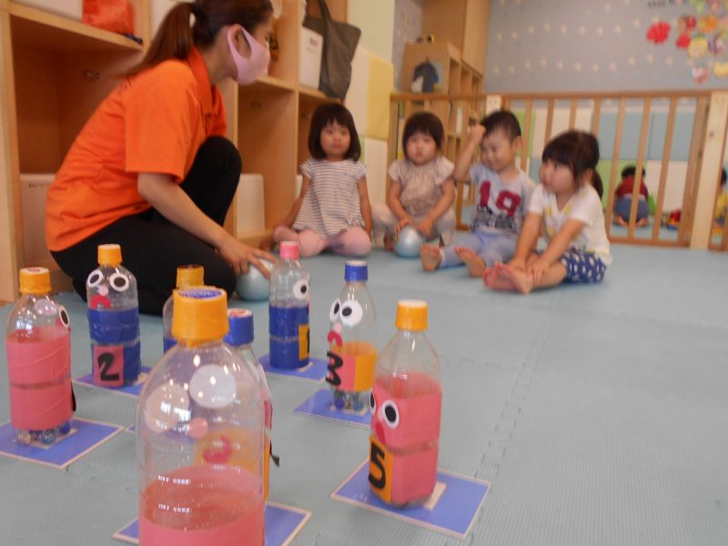 ボールを転がした後は、大急いで倒れたピンを立てる子どもたち![]()