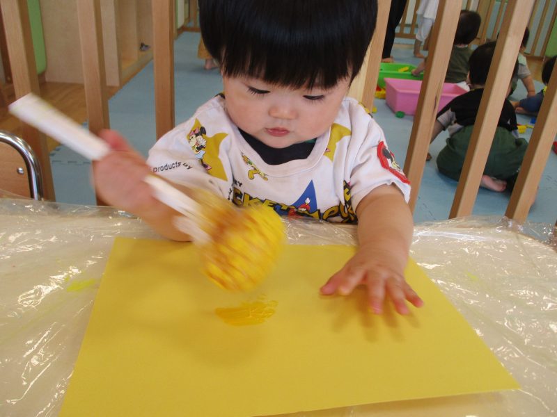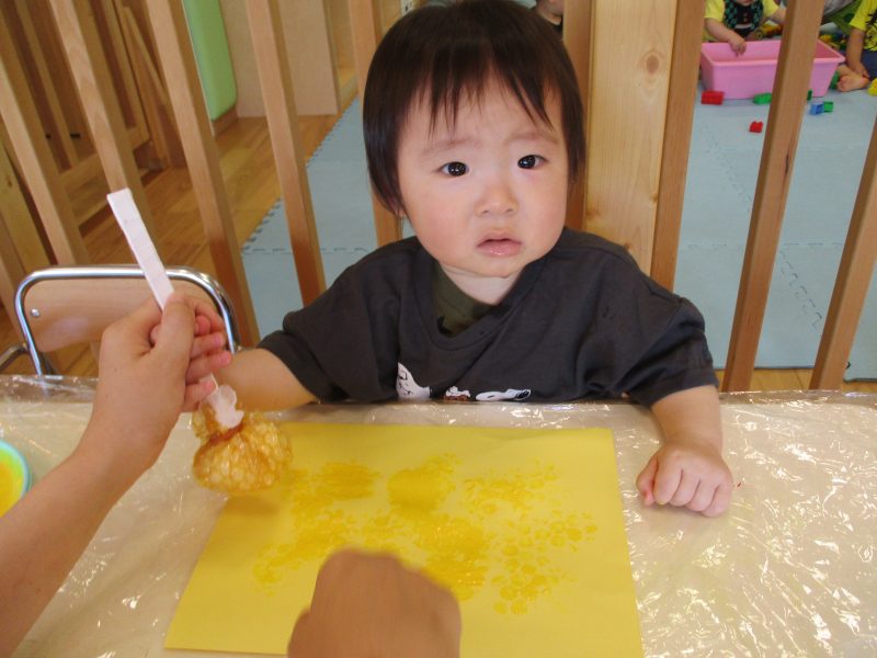 はじめは「何かな??」と不思議そうな表情をしていましたが、プチプチスタンプを押す感触に慣れてくると…ニッコリ