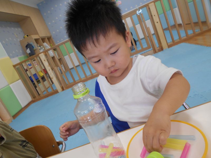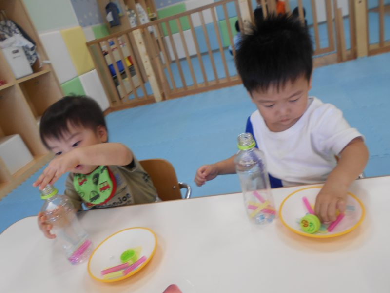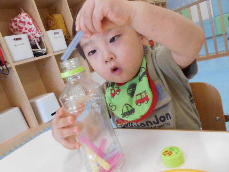 ストローとビーズの音が合わさって、楽しい音がするね~![]()