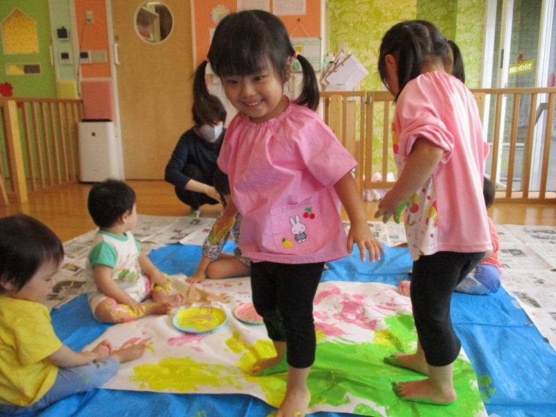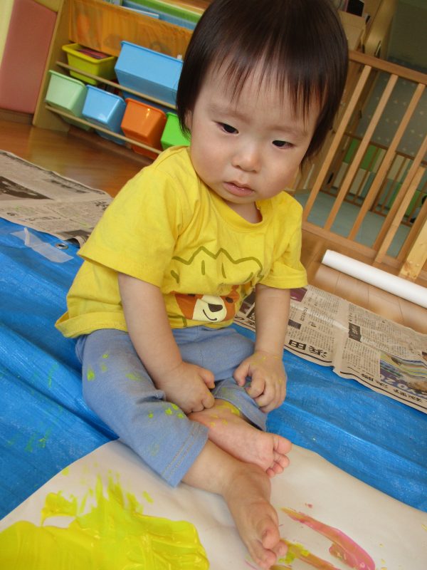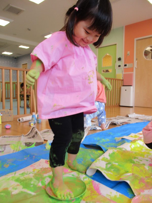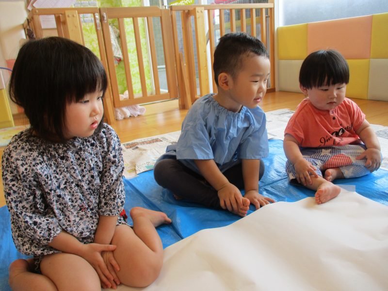 今日は手や足を使って絵の具あそびをすることを伝えると・・