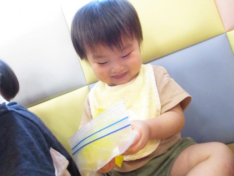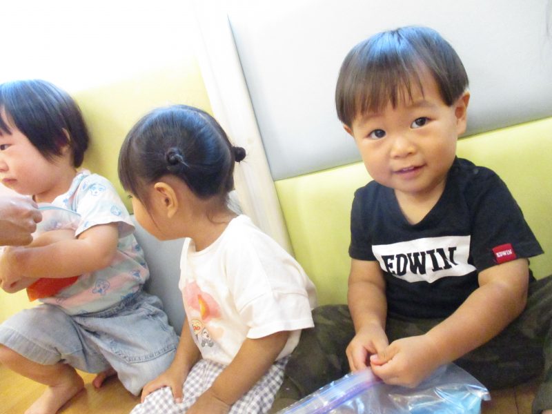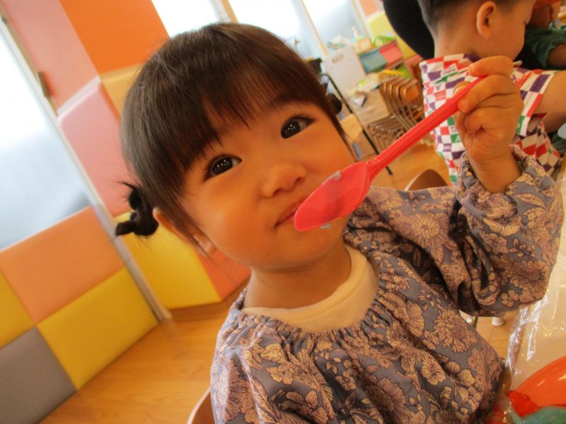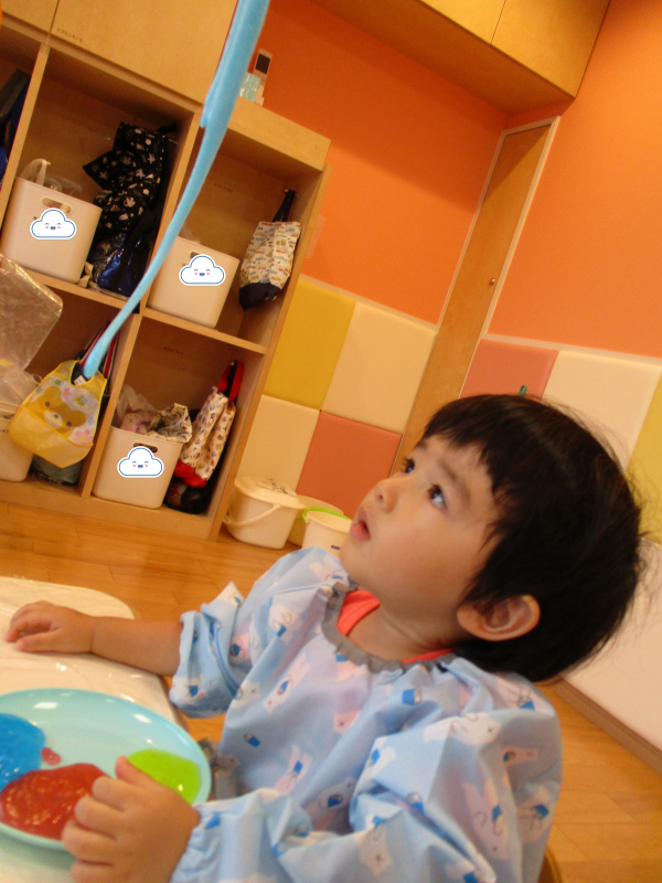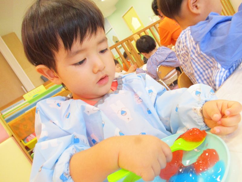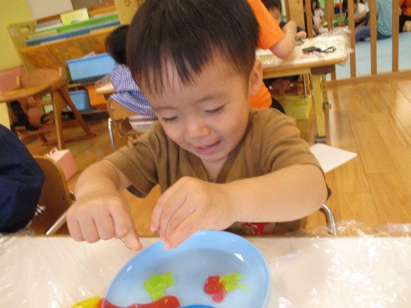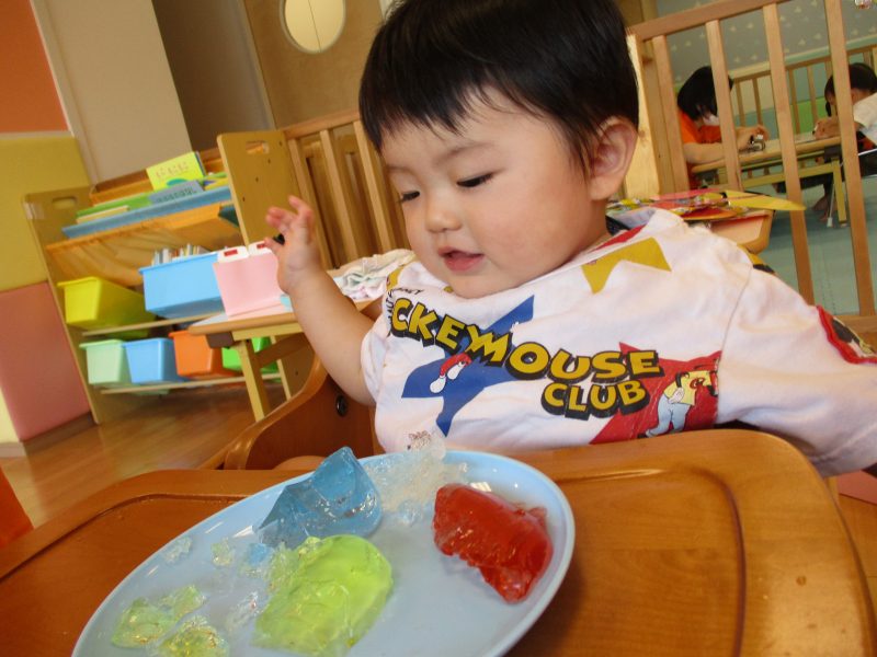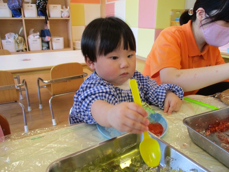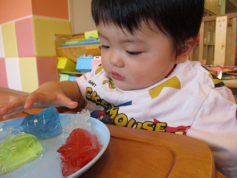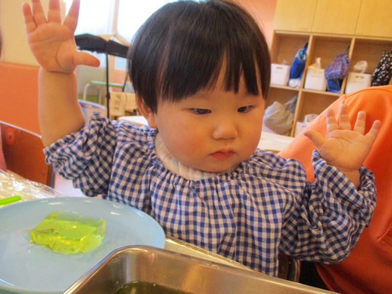 もも組さんは初めて触る寒天に少しドキドキしてしる様子でしたが、一度触ると『もっと、もっと』と自分から手を伸ばし感触を楽しんでいました![]()