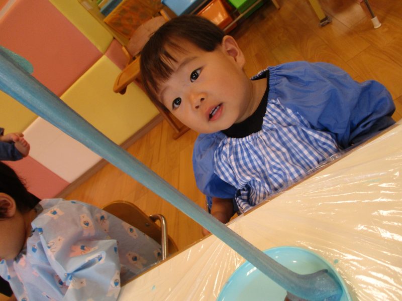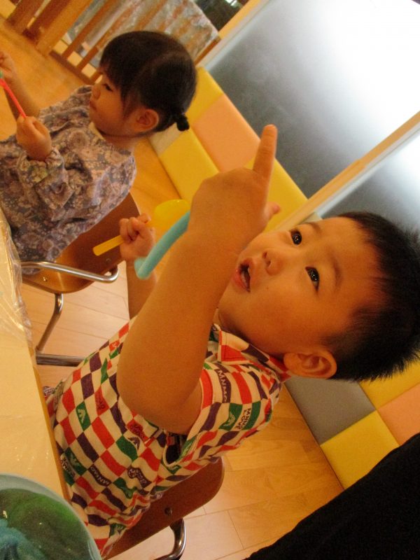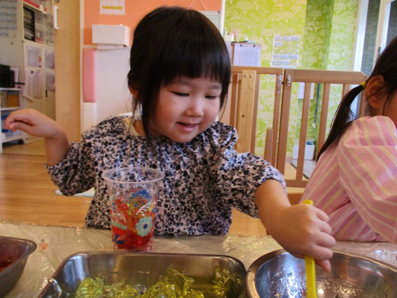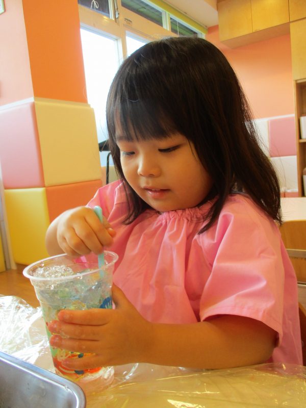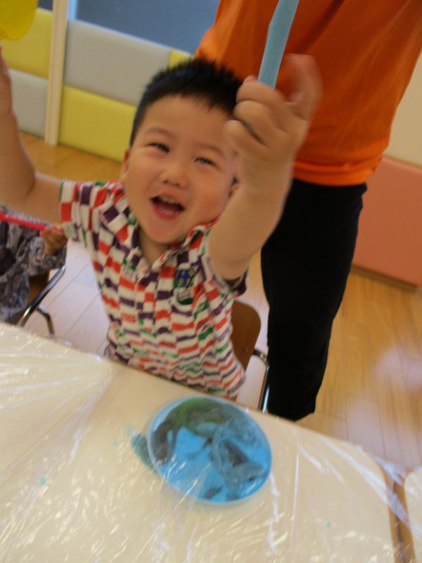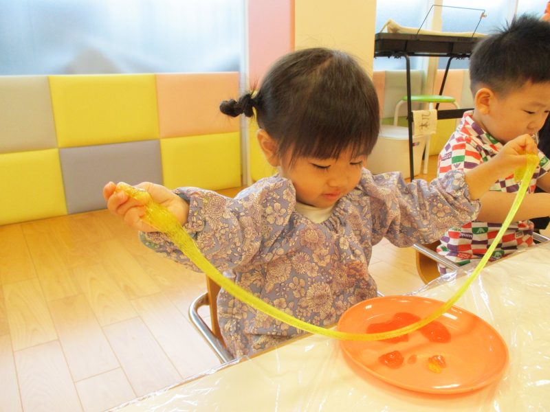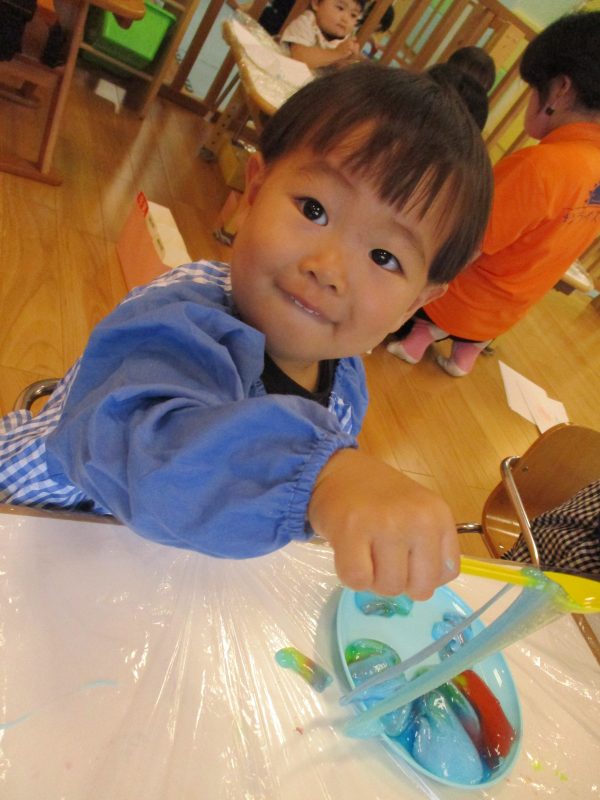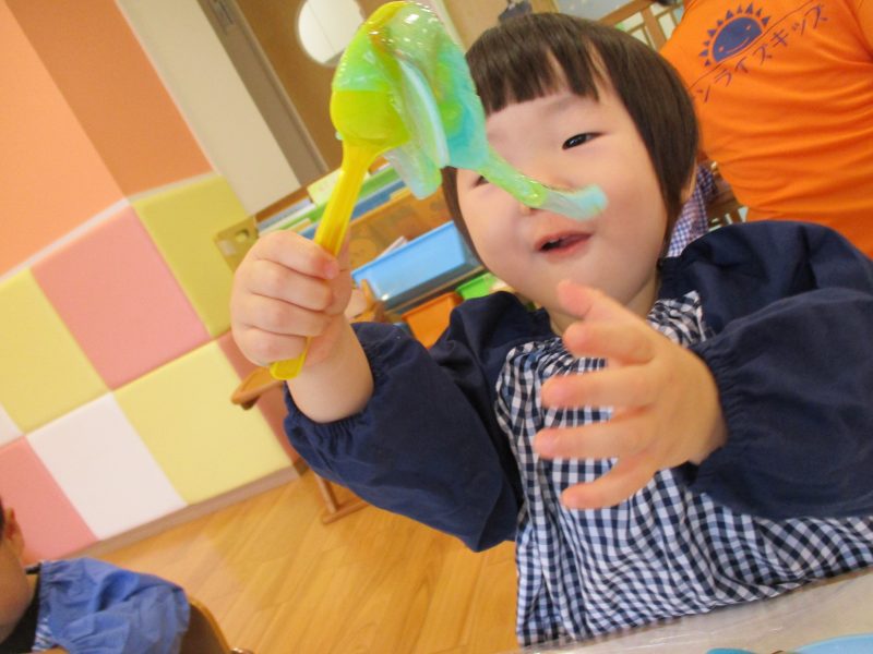 』と夢中な様子で、違う色のスライムを混ぜたり、スプーンですくったり色々な遊び方を見つけて楽しんでいました![]()