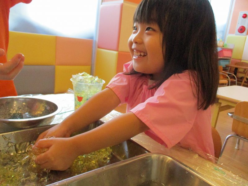 こちらも赤・青・黄色などカラフルなスライムに子どもたちも興味津々![]()