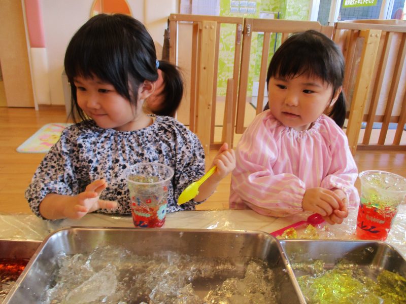 りんご組さんともも組さんは寒天あそびをしました![]()