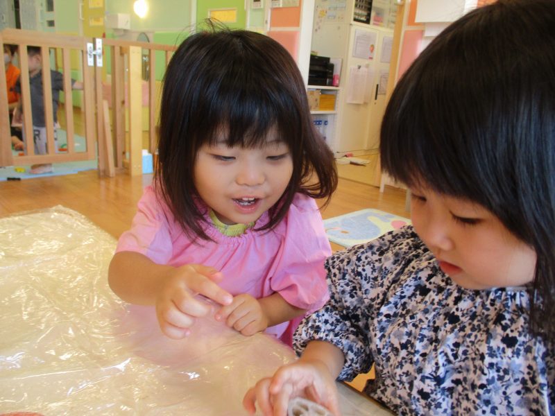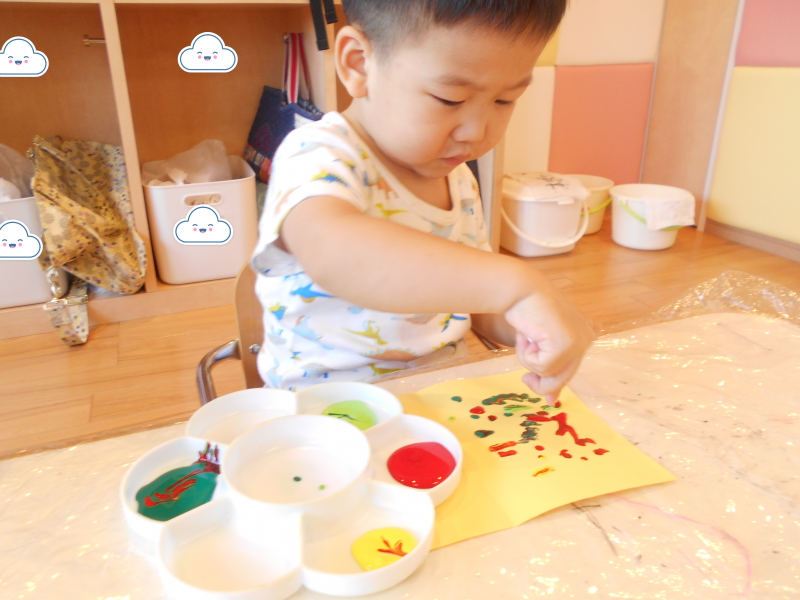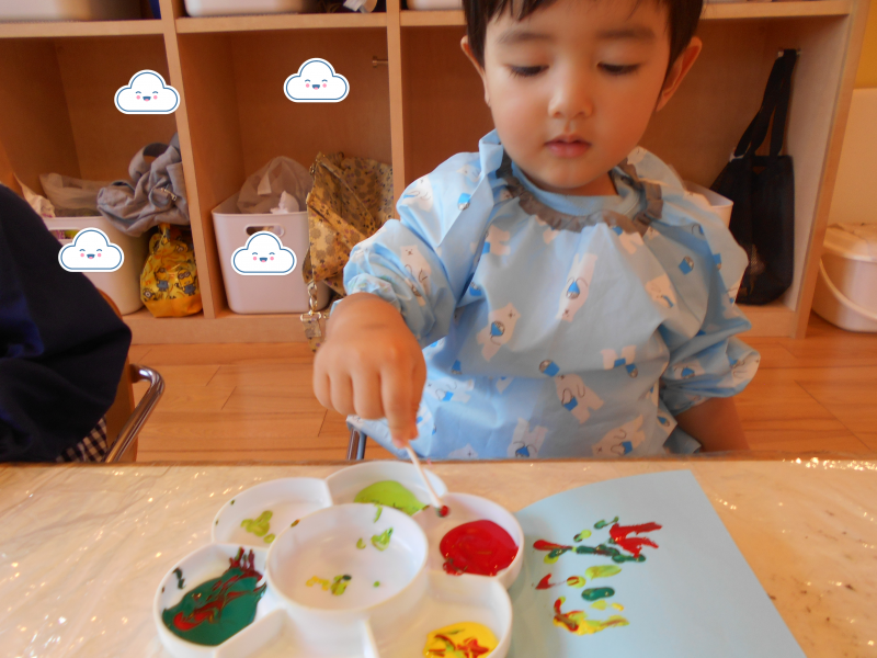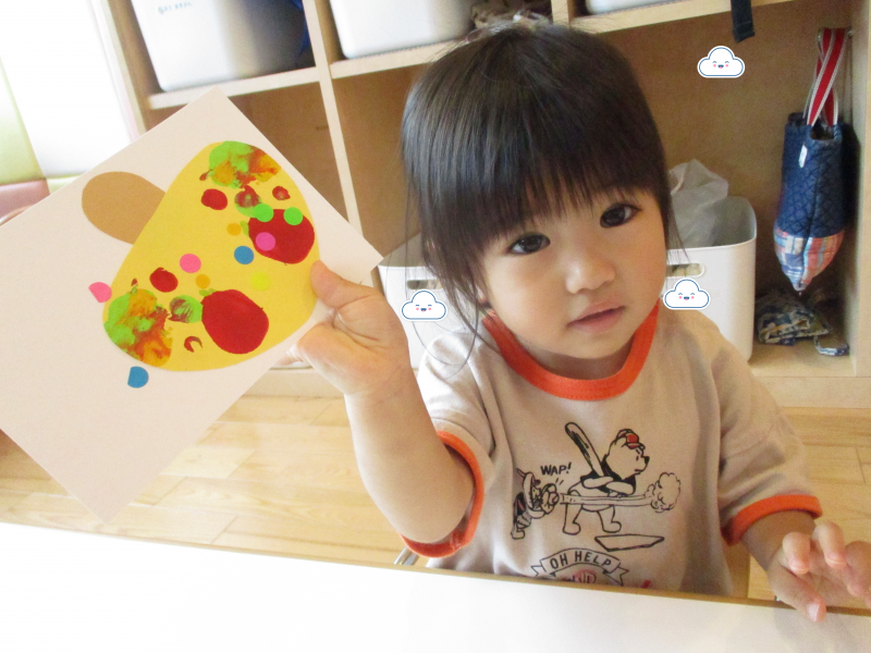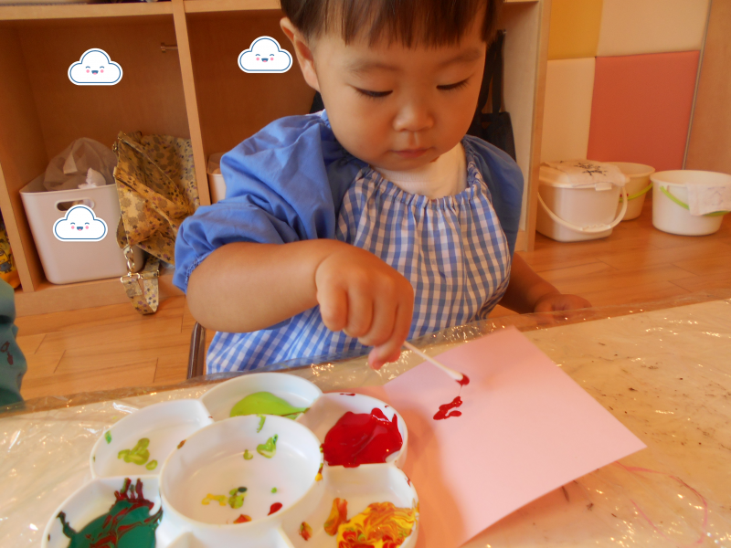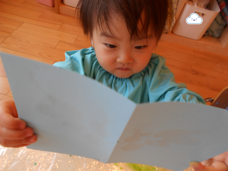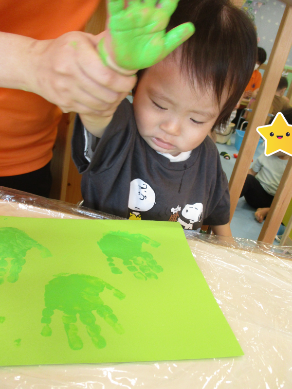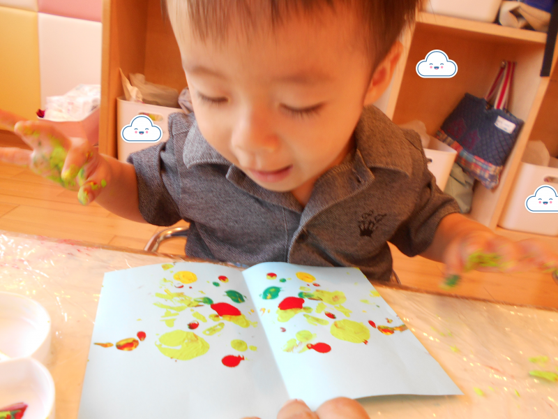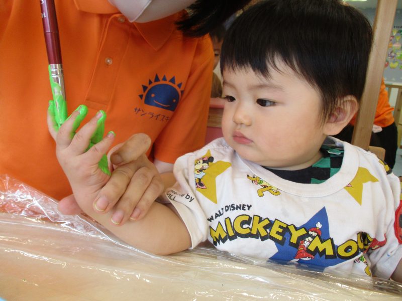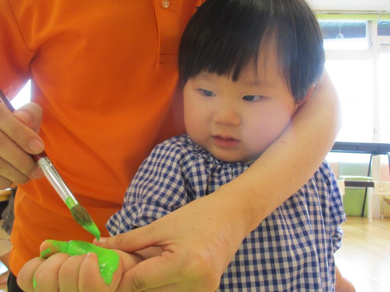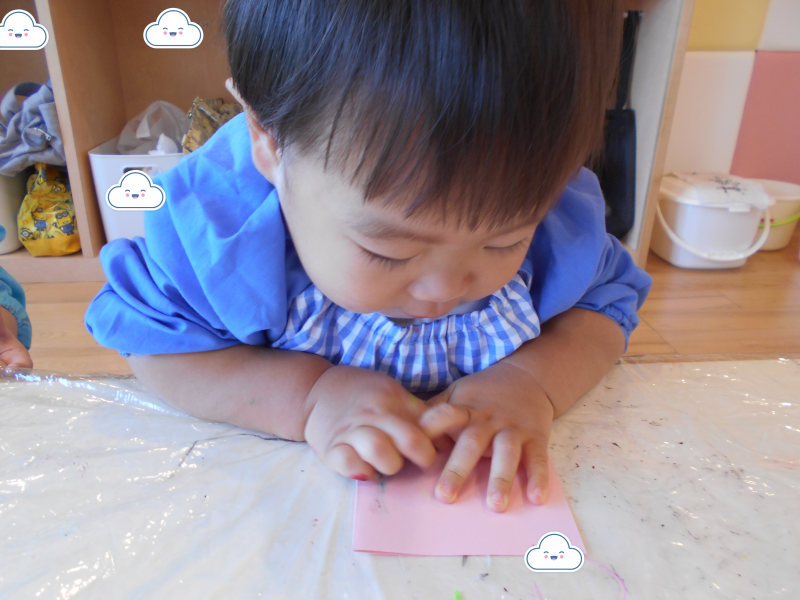 もも組さんも画用紙に絵の具がつく様子に興味をもっており、できた模様に手を伸ばそうとするお友だちもいました![]()