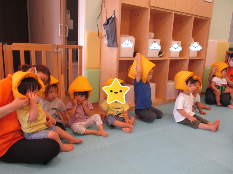 初めは嫌がっていた防災頭巾も『みんなの頭を守ってくれるよ』『頭だいじ~』と繰り返し伝えることで理解し、慣れてきた様子です![]()