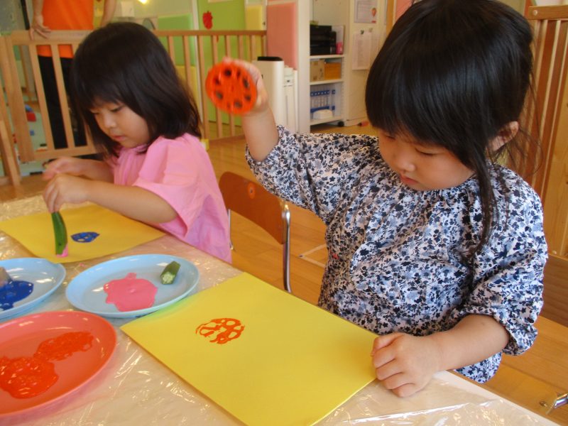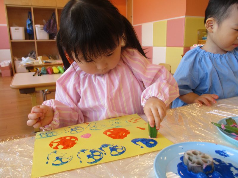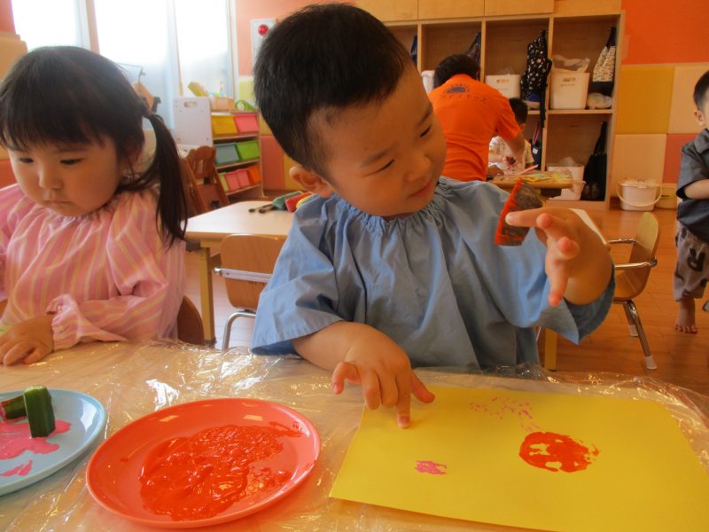 りんご組さんはレンコンとオクラを使って、野菜スタンプに挑戦しました![]()