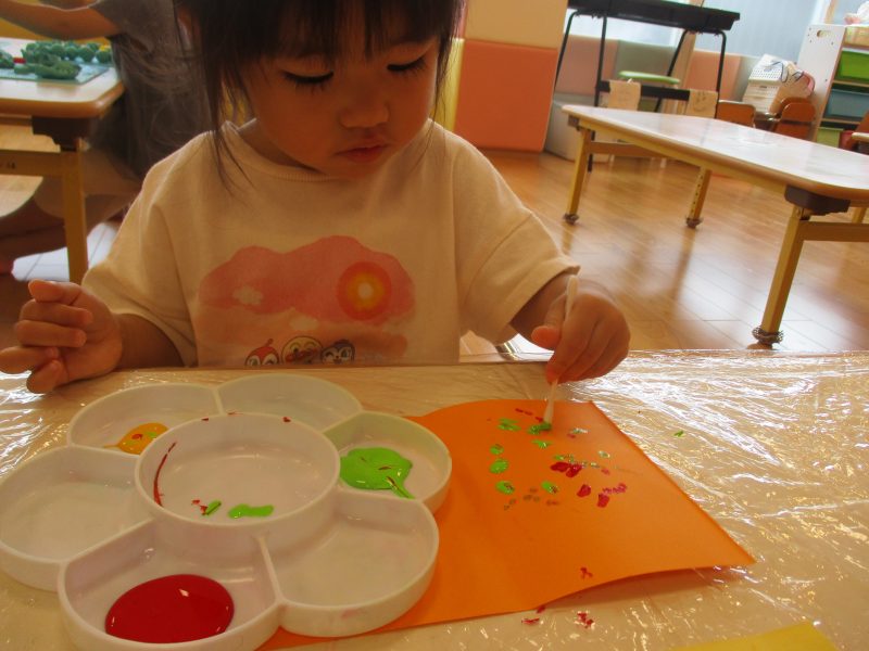 画用紙に綿棒で絵の具をつけ、半分に折って転写させ、開いてみると・・