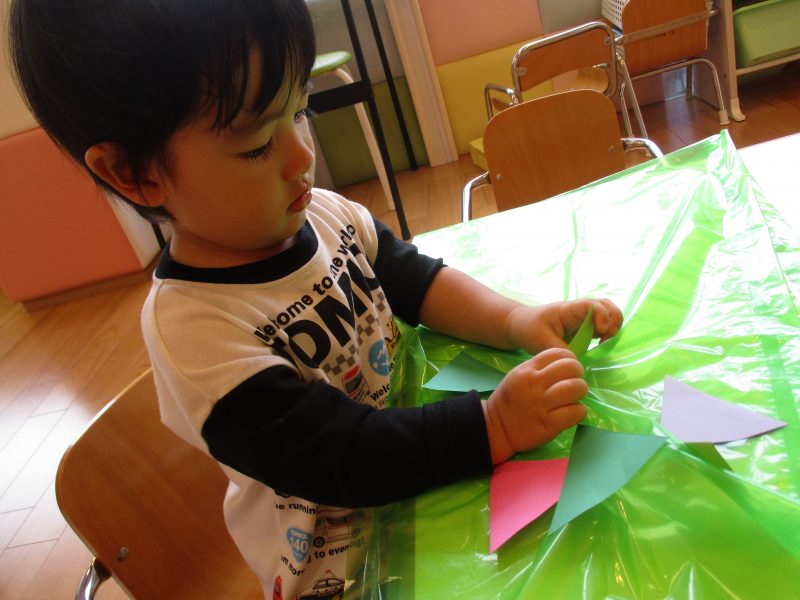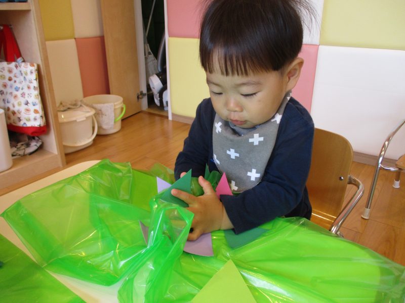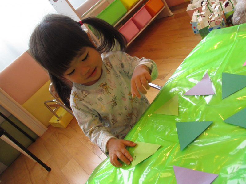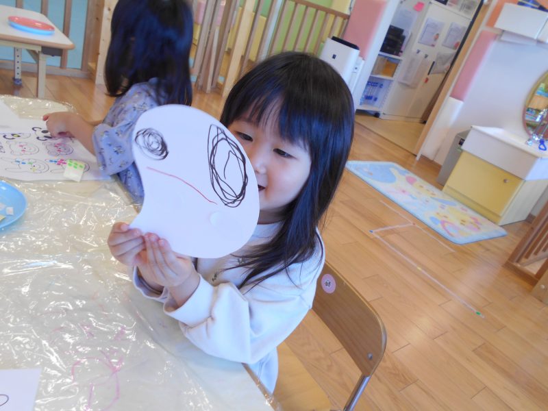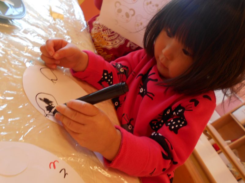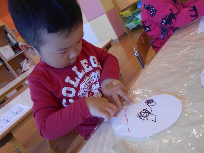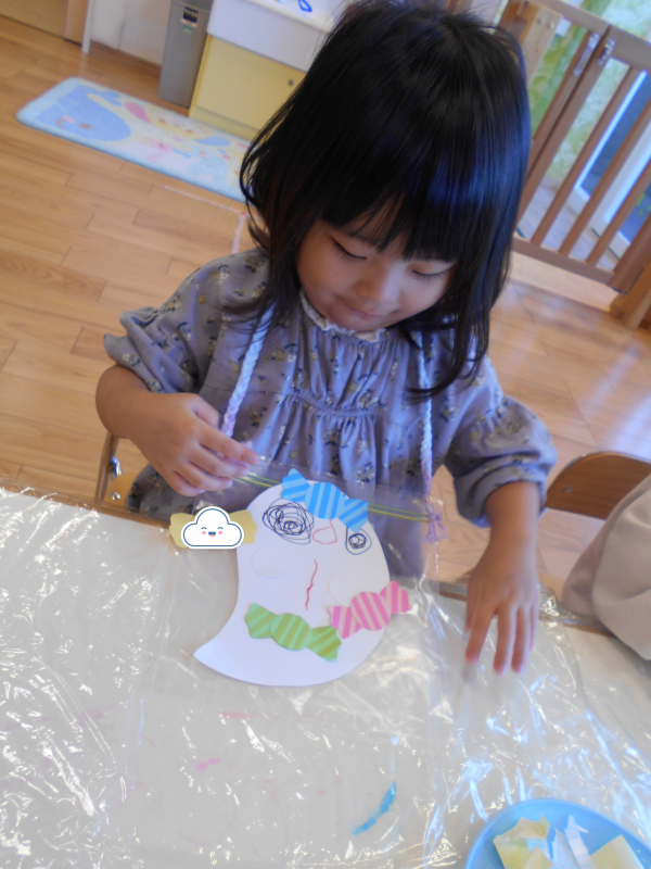 たろうは帽子とマントをつけてドラキュラに、ネズミは袋を被り目と口のところに穴を空けてオバケに、ネコは黒い紙を切って羽を作りコウモリに、ブタはトイレットペーパーを使って・・何になるのでしょう?![]()