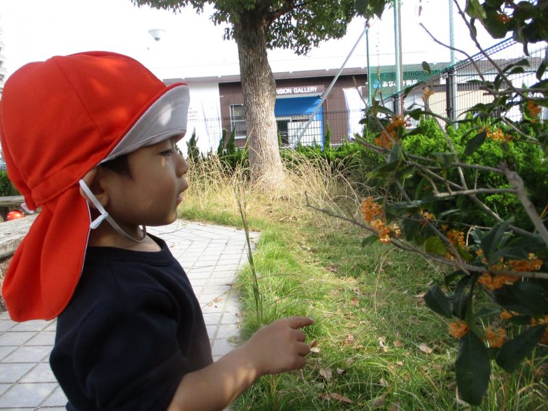いつも遊びに行っている公園では金木犀がきれいに花を咲かせており、子どもたちも顔を近づけて『いい匂いがする~