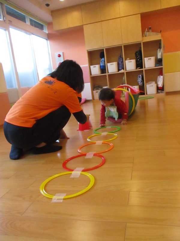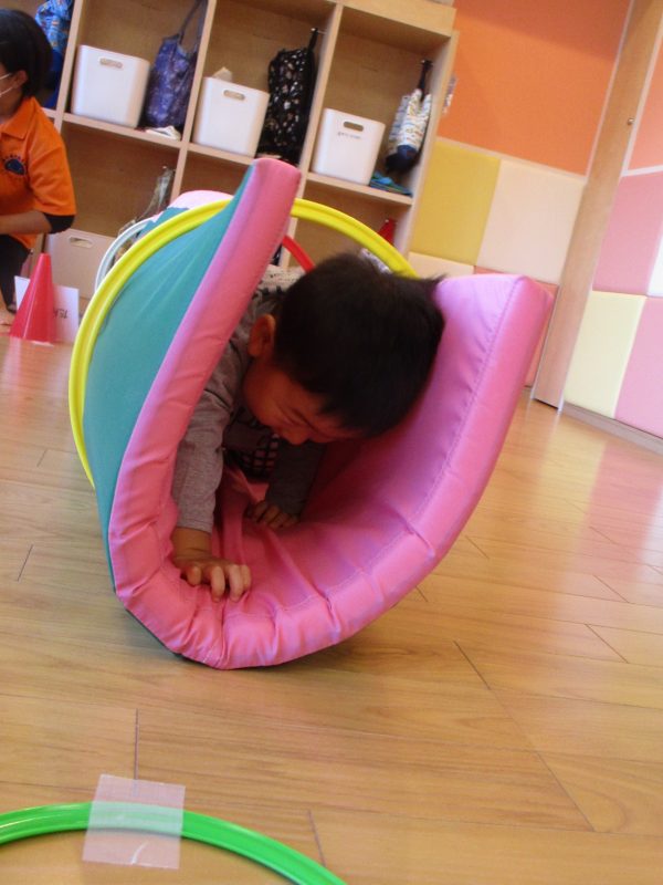 マットとフープで作ったトンネルを子どもたちは身体を小さくしながら、すいすいすーい![]()