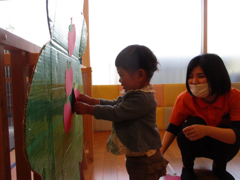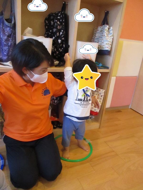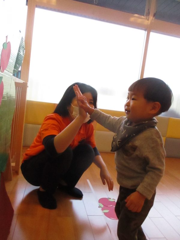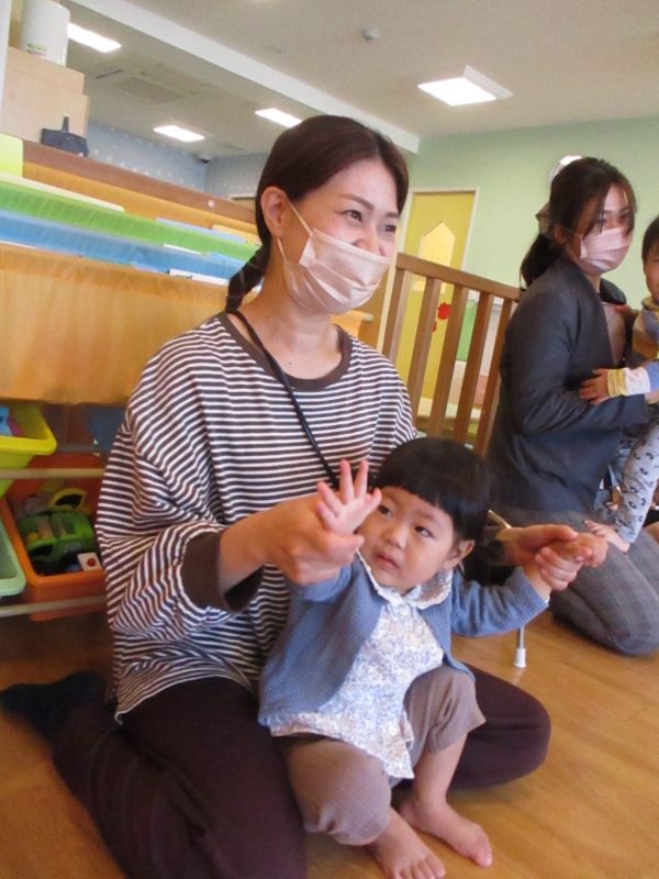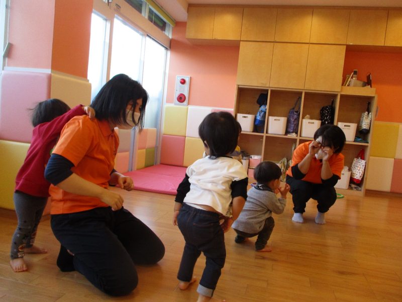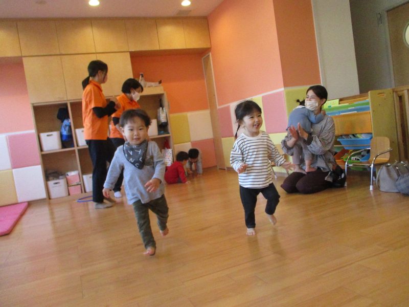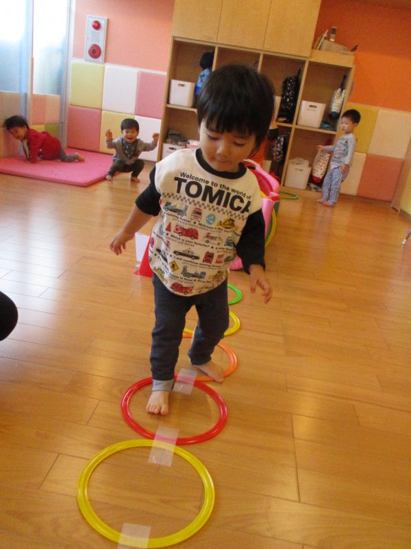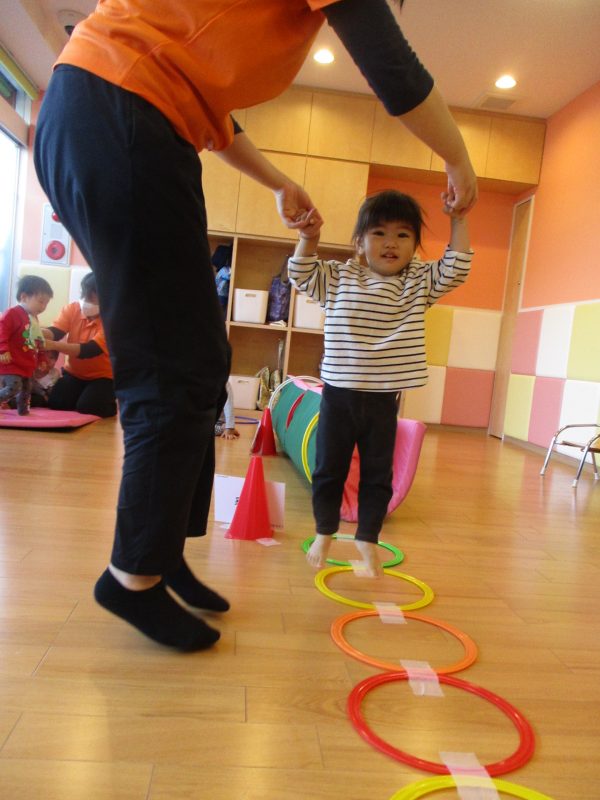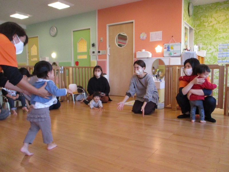 お母さんや保育者と手を繋いだり、『ピョンピョン』のかけ声に合わせたりしながら進んでいきます?