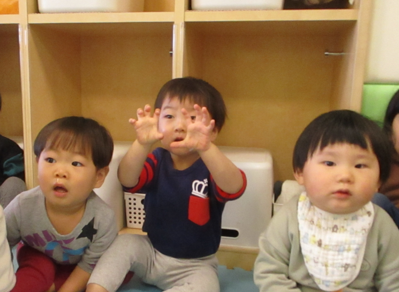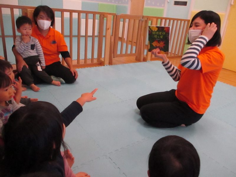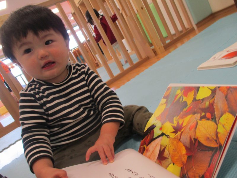 身近な秋の自然が満載な絵本に『足がまつぼっくりになってる!』『手がどんぐり!!』と発見を楽しんでいました![]()