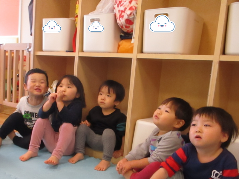 『葉っぱをふーってふいてみて。ふーっ!』の言葉に合わせて、子どもたちも一緒に・・