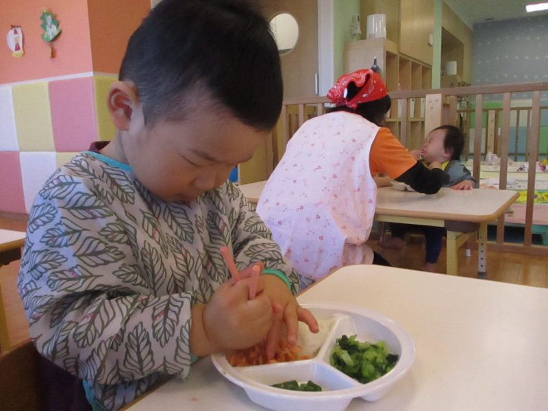 食べる時には『見て見て!』『上手に掴めたよ!!』とやる気満々![]()