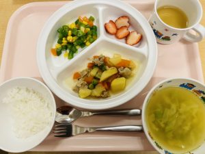 ※給食を食べながら、「今日のおやつな~に?」という声が聞こえ、おやつも楽しみにしている様子でした。お話しも上手になり、ほのぼのとした給食の時間になりました♪