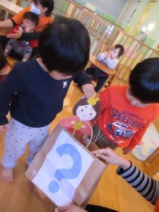 くじ引きのようでドキドキ・ワクワクしながら袋の中に手を入れる子どもたち