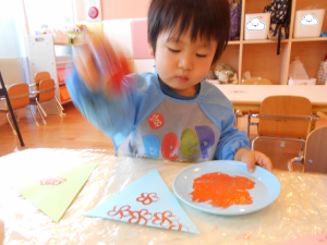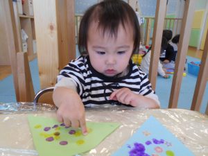 色画用紙にスタンプをしたり、シールを貼ったりして飾り付け